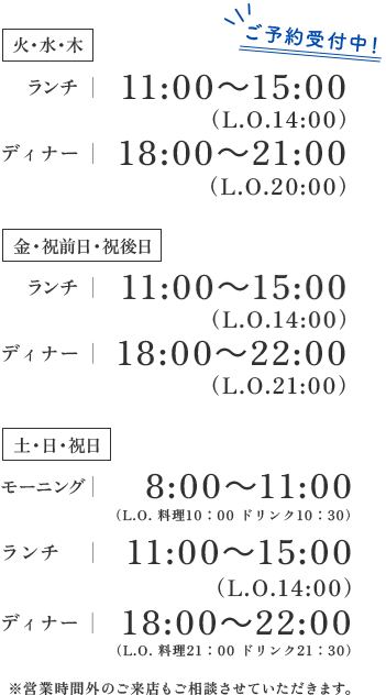 | 営業時間 | 火・水・木 【ランチ】11:00~15:00(L.O.14:00) 【ディナー】18:00~21:00(L.O.20:00) 金・祝前日・祝後日 【ランチ】11:00~15:00(L.O.14:00) 【ディナー】18:00~22:00(L.O.21:00) 土・日・祝日 【モーニング】8:00~11:00(L.O. 料理10:00 ドリンク10:30) 【ランチ】11:00~15:00(L.O. 14:00) 【ディナー】18:00~22:00(L.O. 料理21:00 ドリンク21:30) ※営業時間外のご来店もご相談させていただきます。 |